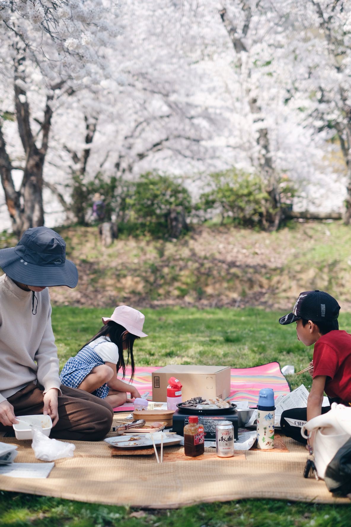 桜の下でゴザを敷きお花見焼き肉