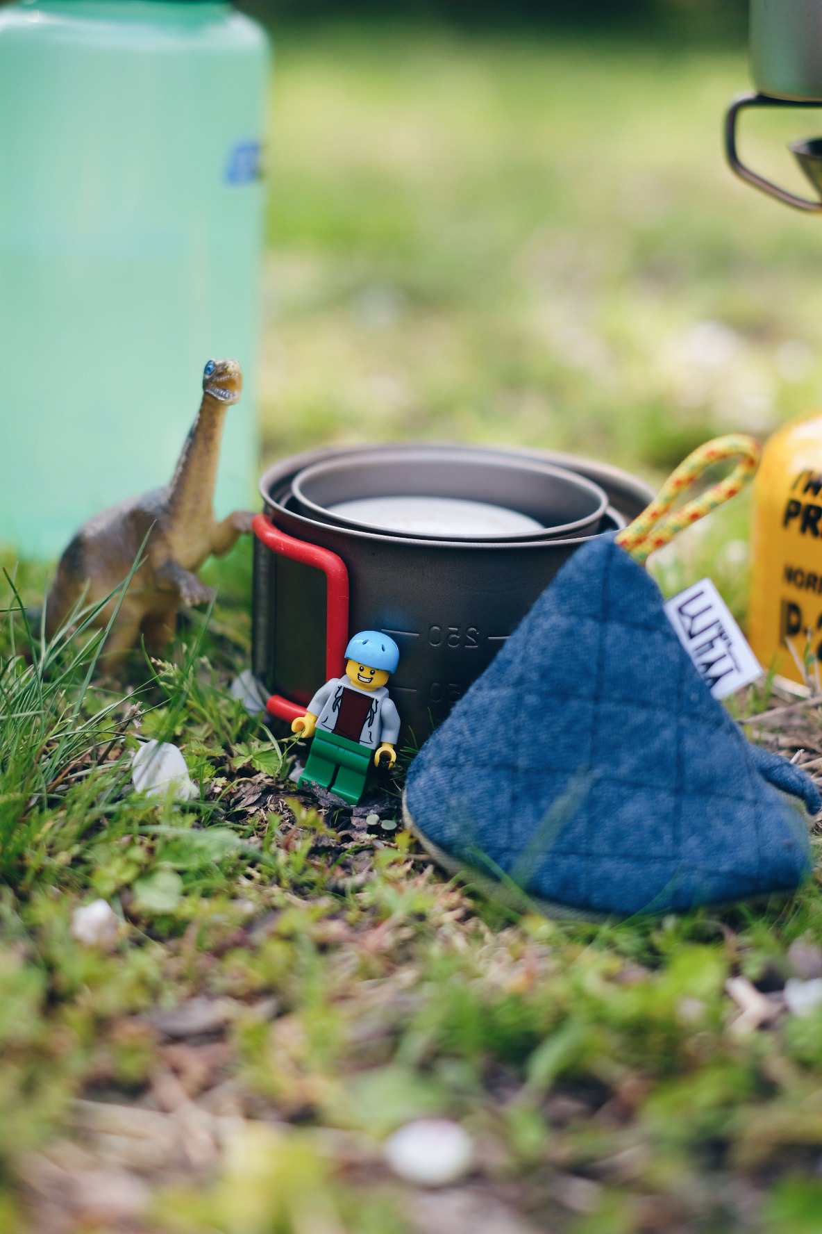 子が持参したレゴと恐竜。そして、山旅の山型鍋つかみ。